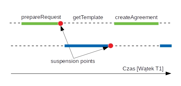 The green color indicates the prepareAgreement function while the blue color indicates some other coroutine. While fetching the agreement template from another service, the T1 thread executes another coroutine without wasting resources. We assume here that we are using a library that can perform HTTP requests in a non-blocking manner.